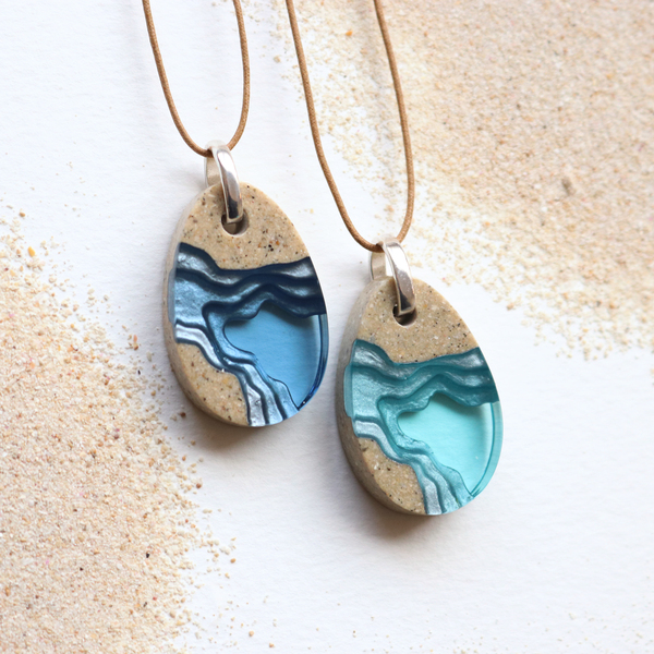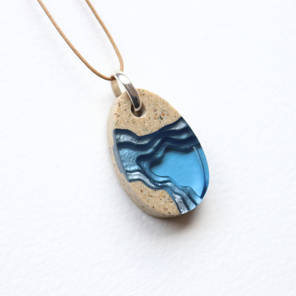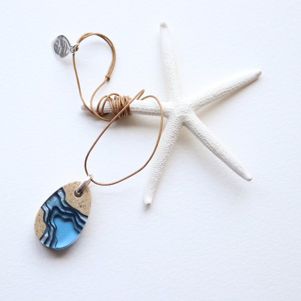 Taking inspiration from the geographic contours of a cove, this tear-drop-shaped necklace design is meticulously handcrafted from bonded beach sand, aquamarine or ultramarine blue resin, and metal pigments. The pendant is elegantly connected to its caramel brown cord by a free-swinging hook, while a sliding knot allows you to adjust the cord's length up to 30"/76cm for a perfect fit.