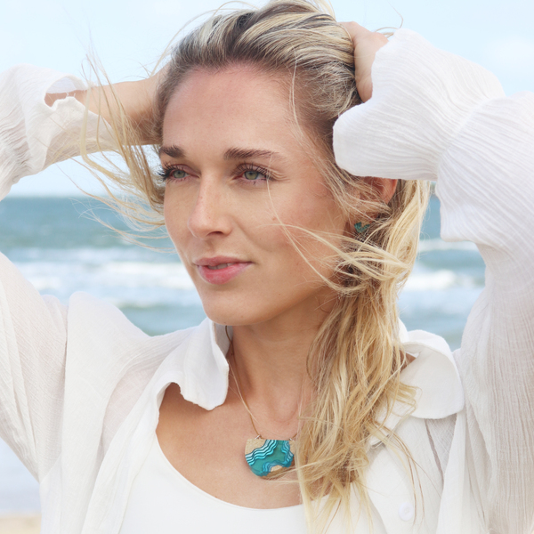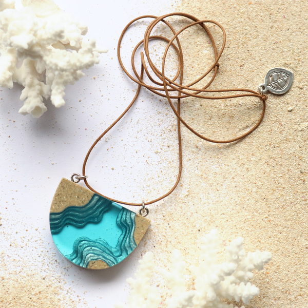 Our Waterway Necklace has been carefully handmade from bonded sand, aqua blue resin and metal pigments with a high-gloss polished finish. Two eye screws together with two jumps rings connect the pendant to its caramel brown cord. The cord has a sliding knot to adjust its length.