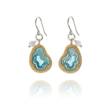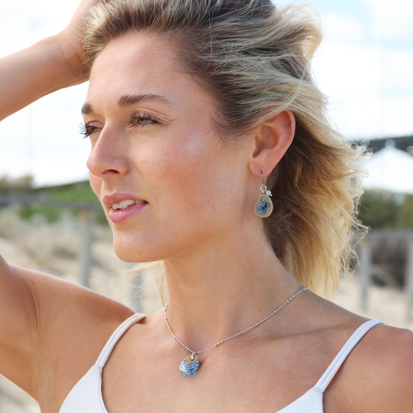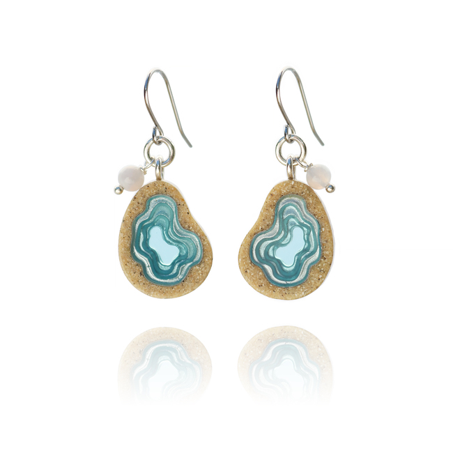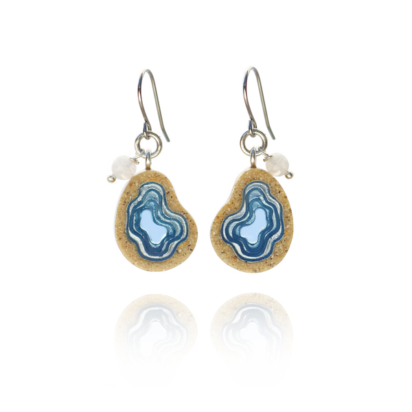 Our Basin earrings showcase an asymmetrical teardrop shape, with bonded sand encasing blue resin. Inspired by oceanic basins, the design echoes their natural form, reflecting the beauty of the sea. Each earring dangles on an allergy-friendly French ear hook and embellished with a translucent agate gemstone.
