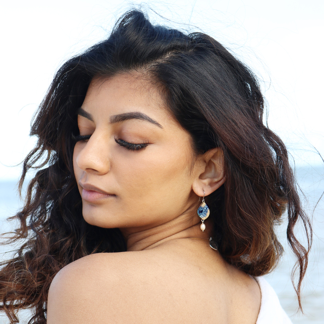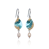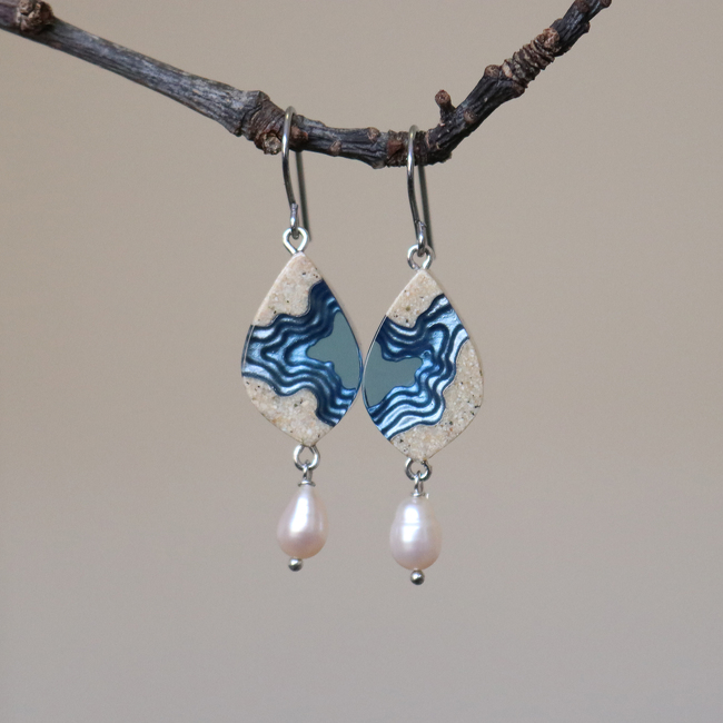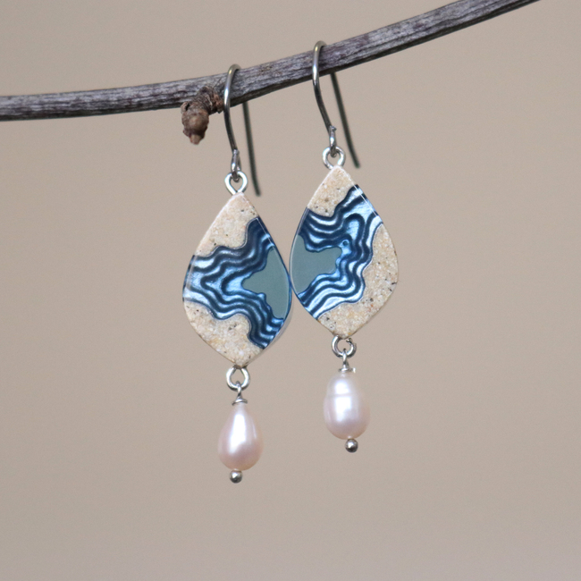 Our Bay earrings feature a delicate leaf shape and have been crafted from bonded sand, aquamarine or ultramarine blue resin and silver metal pigments covering the fine topographic layers of the earrings. An elegant freshwater pearl with a slightly peachy/pink luster dangles below each earring to complement the design. Small eye-pins connect each earring to an allergy-friendly stainless steel french hook.