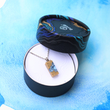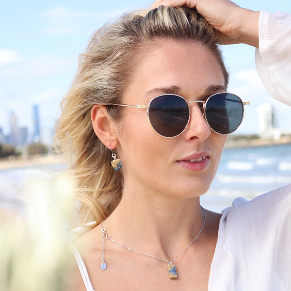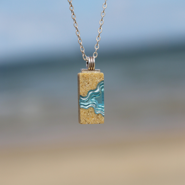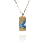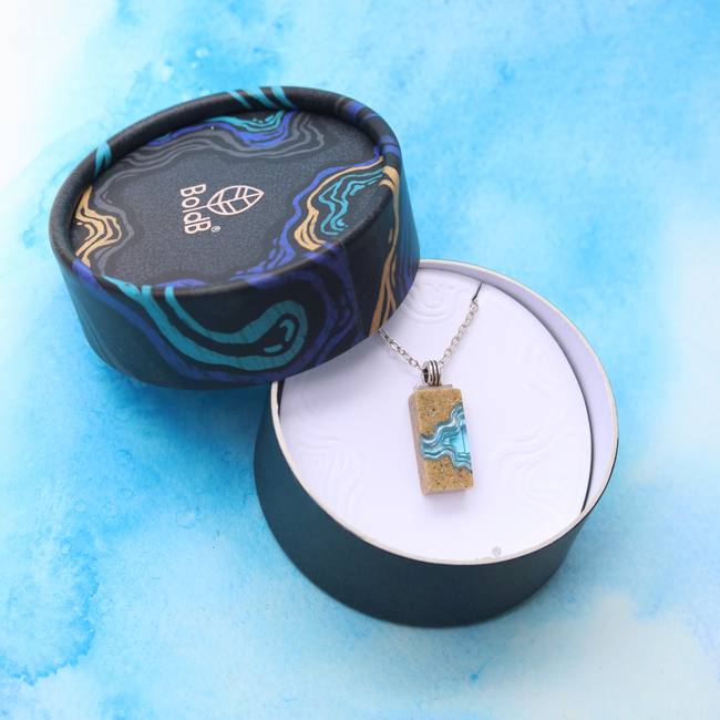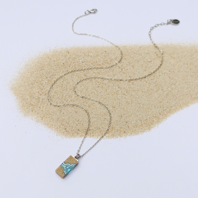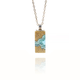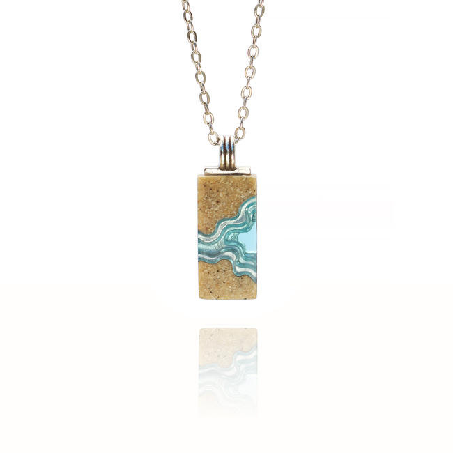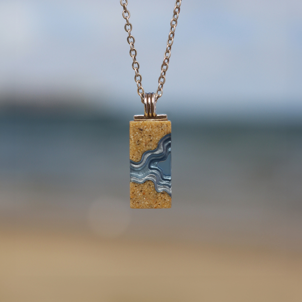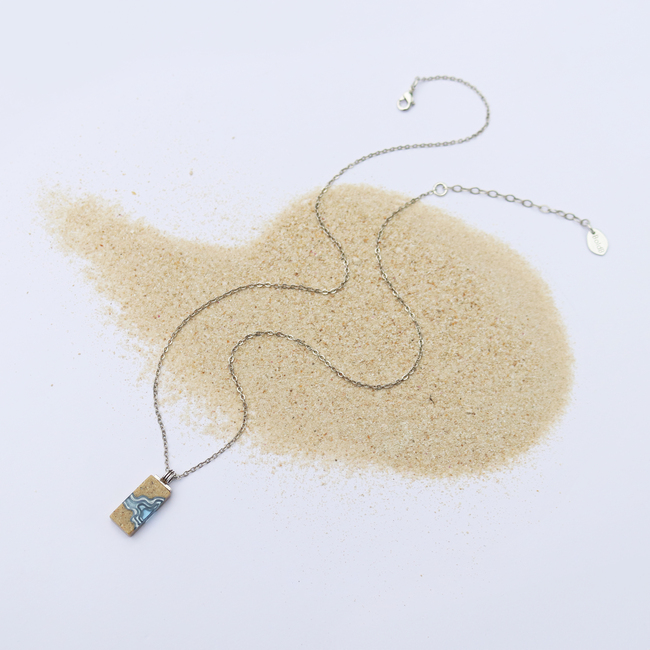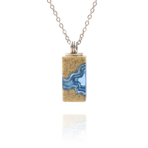 Our Delta necklace showcases a minimalist rectangle design, with layers that mimic the topography of a river mouth meeting the ocean, inspiring its name. The necklace is carefully crafted from bonded beach sand and blue resin and dangles on an 18”/45cm cable link chain with a 2”/5cm extender.