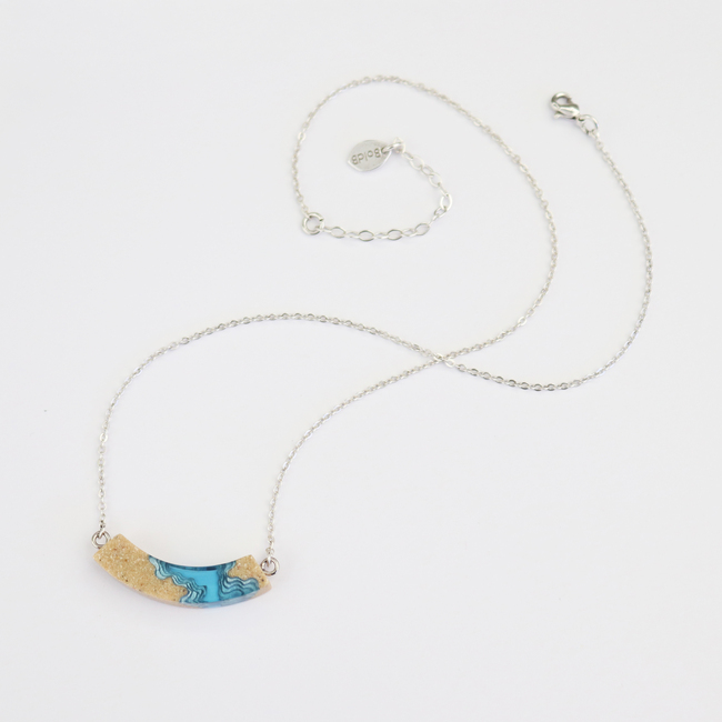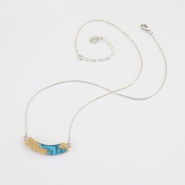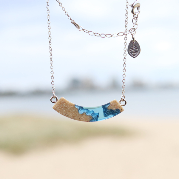 Our Headland necklace features a bold, slightly arched design with layered textures that evoke the topography of two land masses jutting into the ocean. Crafted from bonded beach sand and blue resin, the pendant hangs from a 16”/40cm cable link chain, complete with a 2”/5cm extender for an adjustable fit.