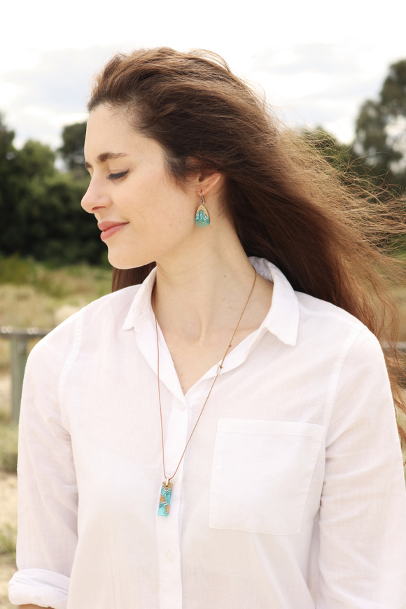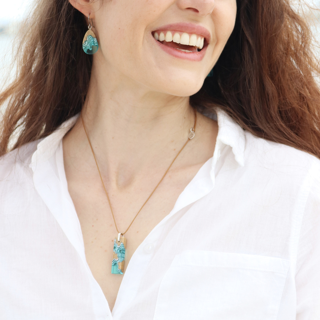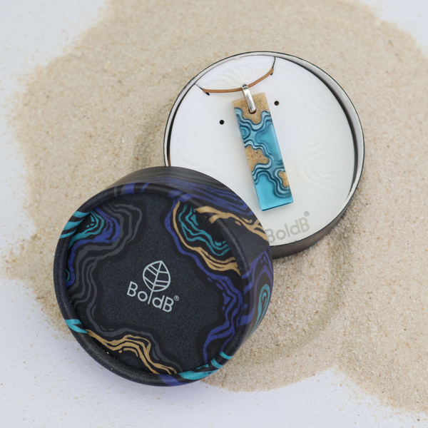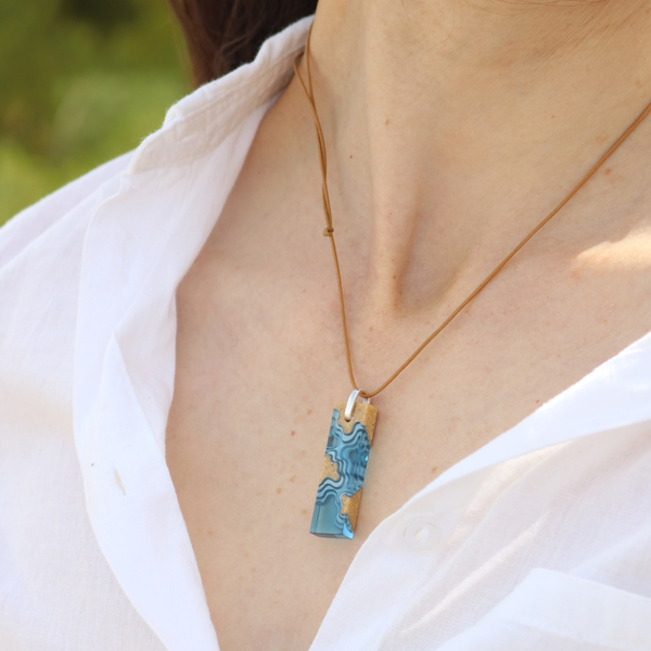 Our Islands necklace showcases a long rectangular pendant with layered textures that evoke the topography of three nearby islands, inspiring its name. Made from bonded beach sand and blue resin, the pendant is suspended on a handcrafted hook, attached to a caramel brown cord with a sliding knot for adjustable length. The cord can be extended up to a maximum length of 28”/70cm.