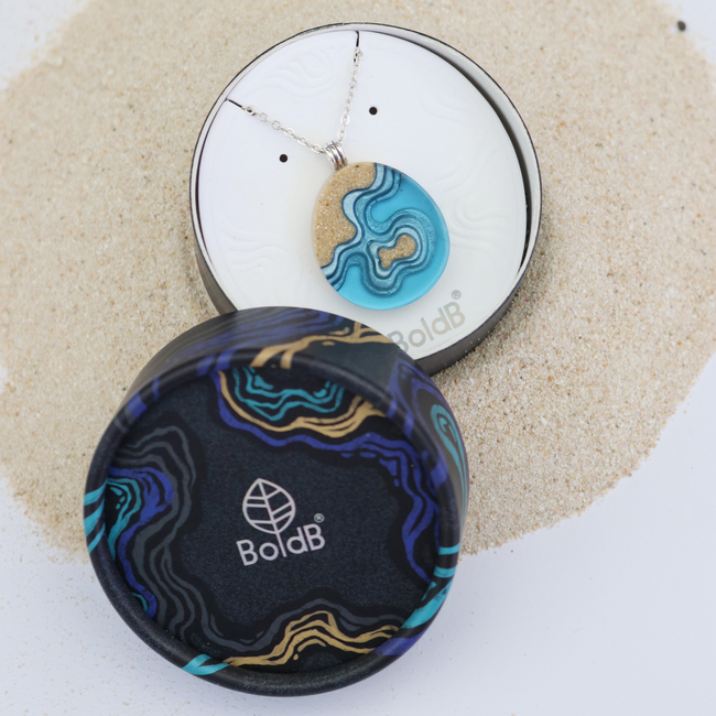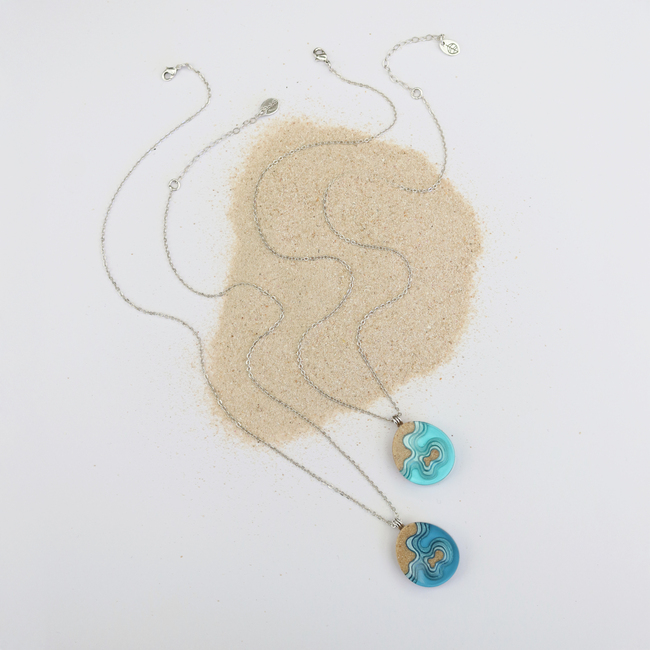 Our Promontory necklace showcases a wide tear drop shaped design, with layers that mimic the topography of a Promontory pertruding into the ocean. The necklace is carefully crafted from bonded beach sand and blue resin and dangles on an 20”/50cm cable link chain with a 2”/5cm extender.