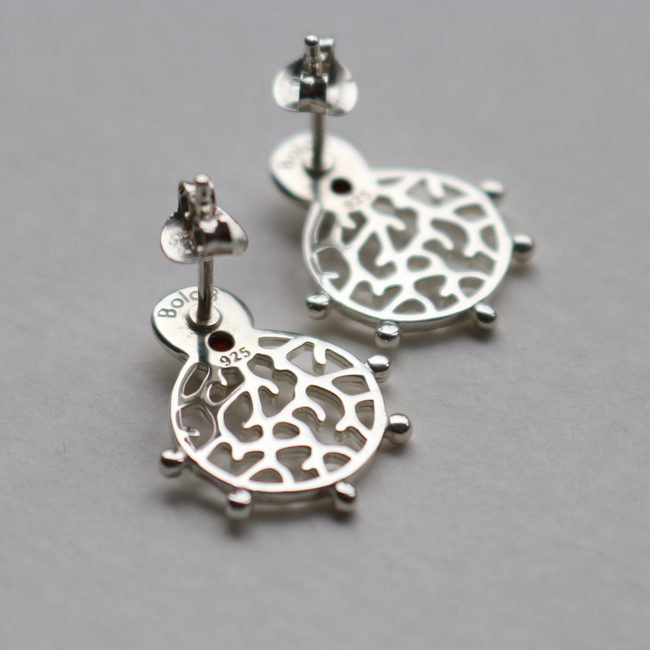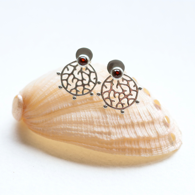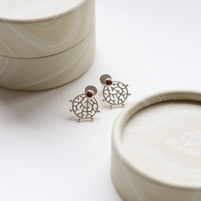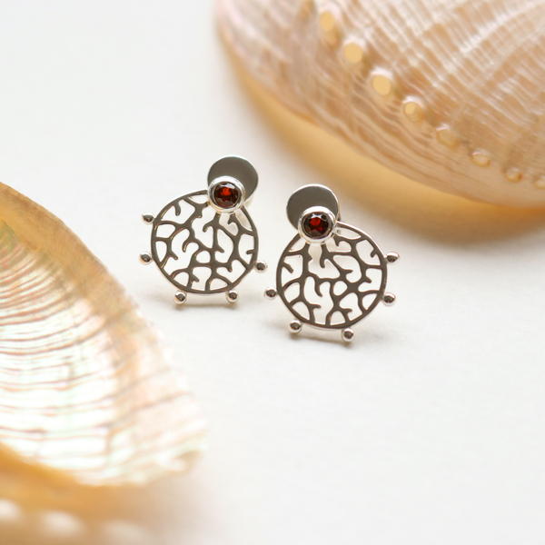 Our Roseni Stud Earrings have been named after the coral species Acropora Roseni and feature a compact round shape with branching coral patterns and a 3mm natural rich red garnet stone. Delicate metal balls decorate the boundary of the design. The ear studs have been crafted from sustainable recycled 925 sterling silver and polished to a shiny finish.