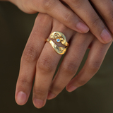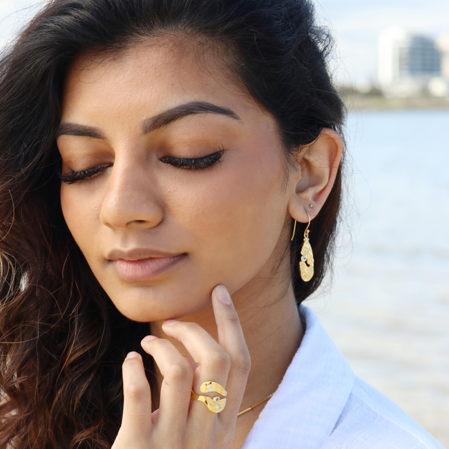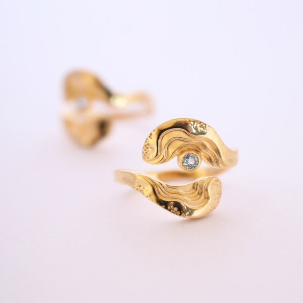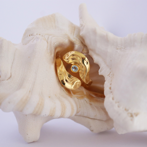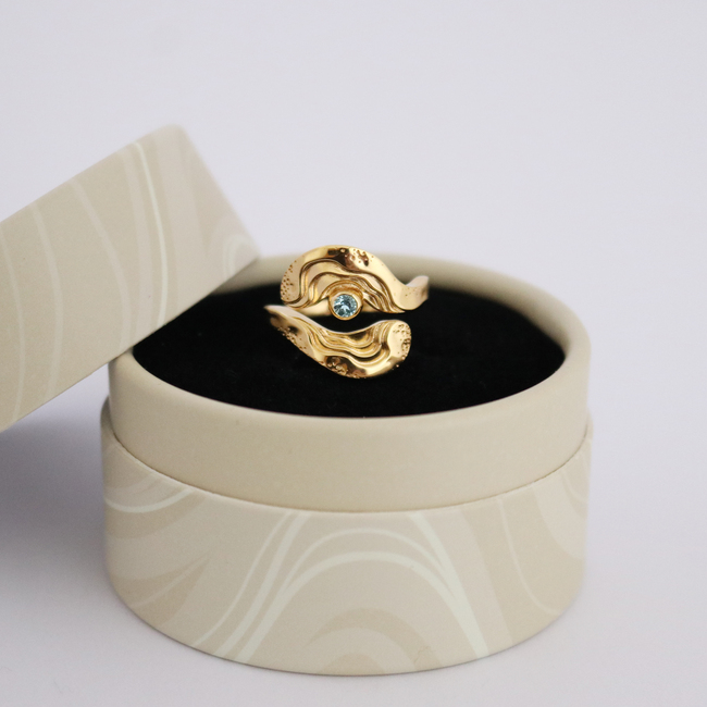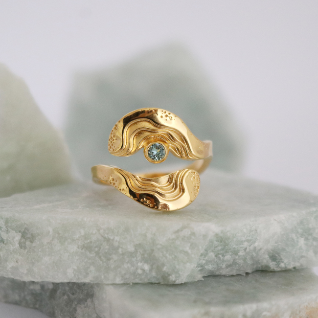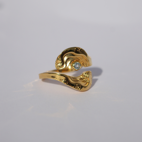 The Serenity Collection draws inspiration from the serene beauty of the ocean and its shores. Our adjustable Sanctuary ring has been carefully crafted by Balinese silversmiths from environmentally friendly recycled 925 sterling silver with 18K gold plating. The design features a beautiful light blue Topaz gemstone, evoking the shimmering essence of water.