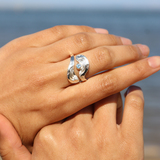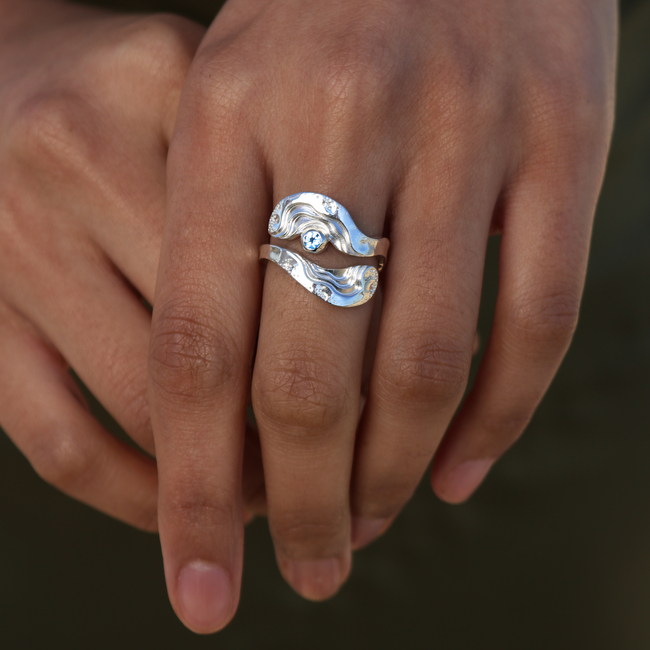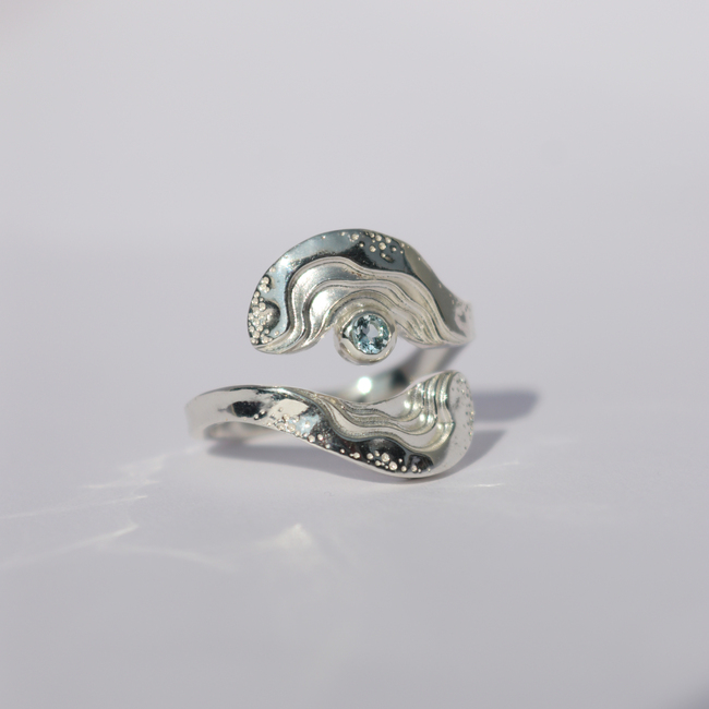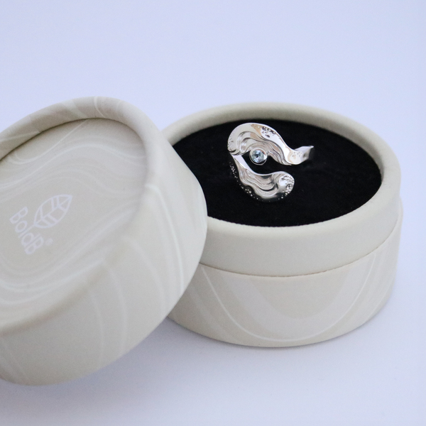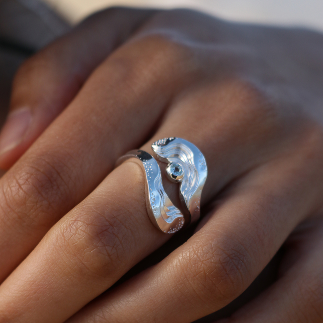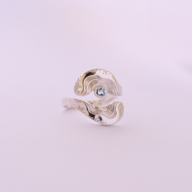 The Serenity Collection draws inspiration from the serene beauty of the ocean and its shores. Our adjustable Sanctuary ring has been carefully crafted by Balinese silversmiths from environmentally friendly recycled 925 sterling silver. The design features a beautiful light blue Topaz gemstone, evoking the shimmering essence of water.