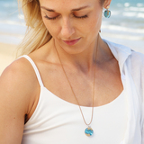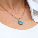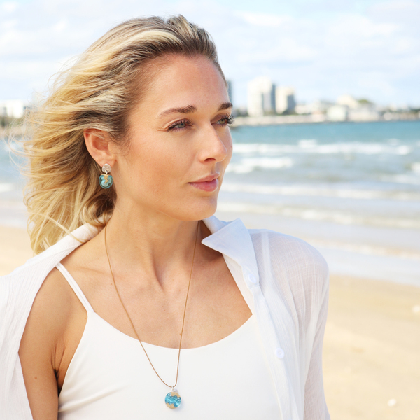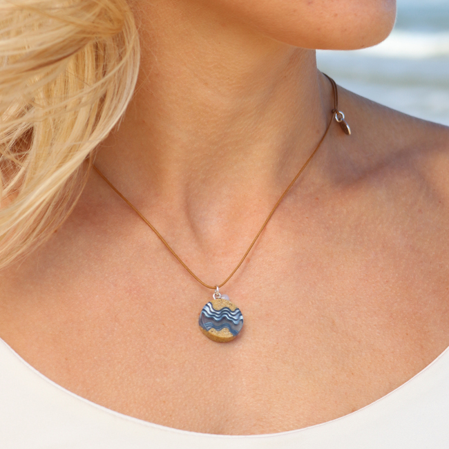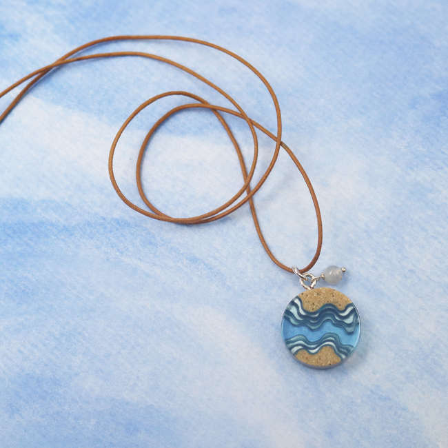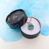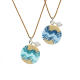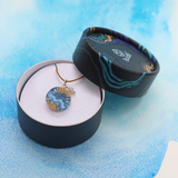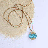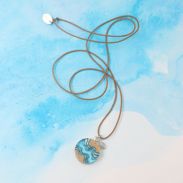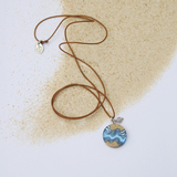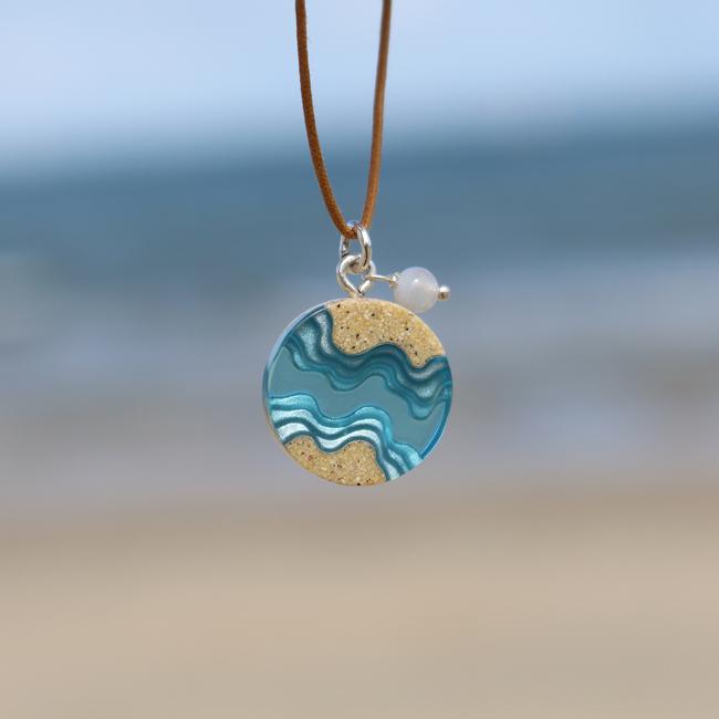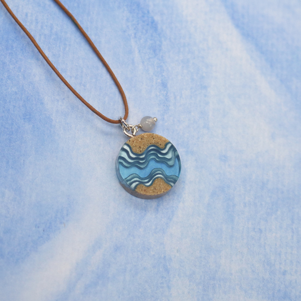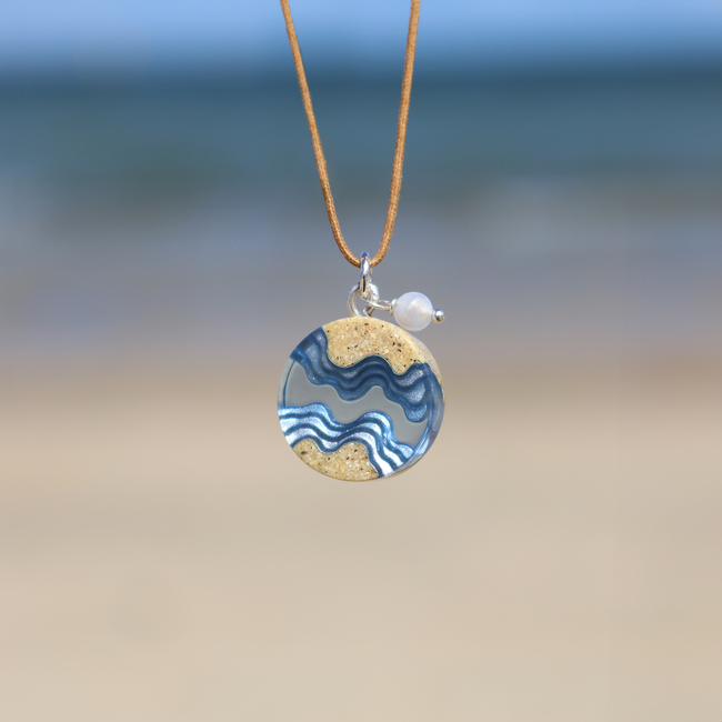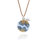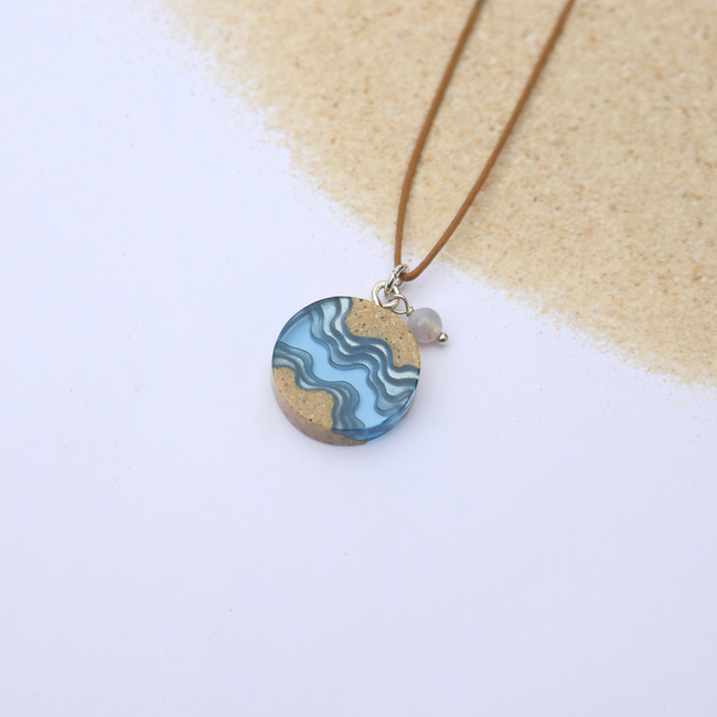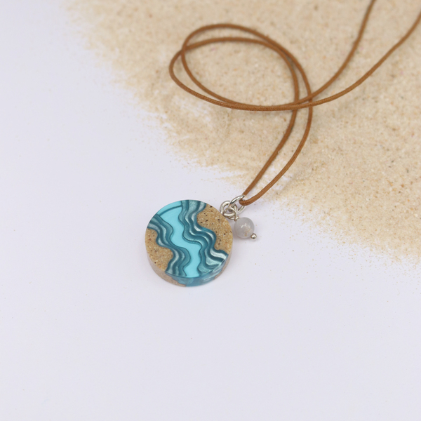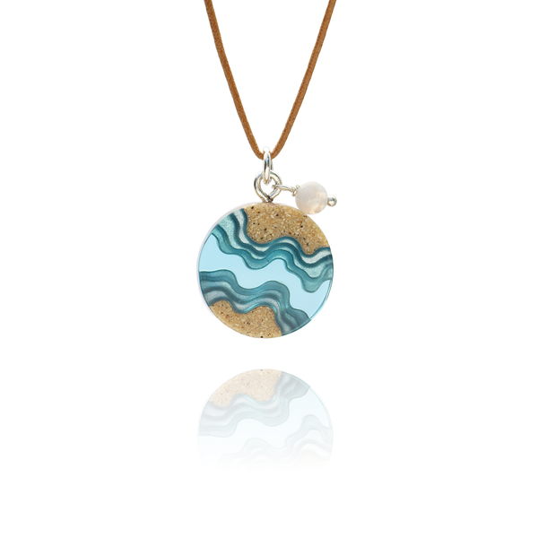 Our Seaway necklace showcases a round design, beautifully crafted from sand and blue resin. The intricate topographic layers within the pendant artfully depict two coastlines surrounding an ocean passage. A small, translucent agate gemstone adds a decorative touch.