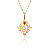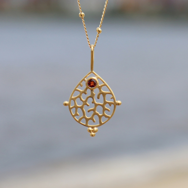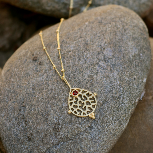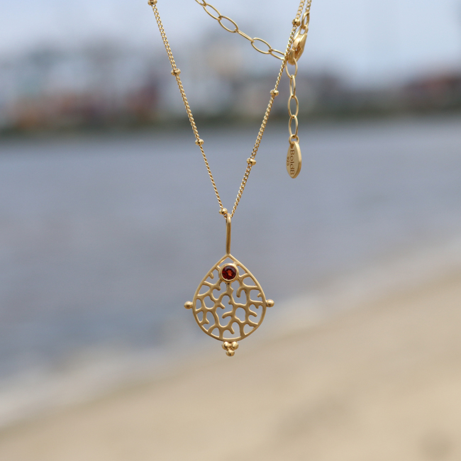 Our Selago Necklace has been named after the coral species Acropora Selago. The design features a 3mm natural rich red garnet stone and branching coral pattern with delicate metal balls decorating the tear drop shaped boundary of the pendant. The pendant has been carefully hand brushed to an elegant matte finish. The pendant rests on a 44cm long delicate polished cable link chain featuring small metal balls and a 5cm chain extender featuring our logo. The pendant and chain have been crafted from sustainable recycled 925 sterling silver and 18K gold plated.