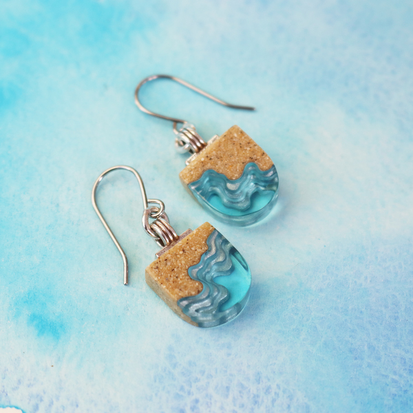 Our dainty Shoreline earrings feature a U-shaped design crafted from bonded sand and blue resin, resembling the shore and ocean. The earrings dangle on allergy-friendly stainless steel French ear hooks.